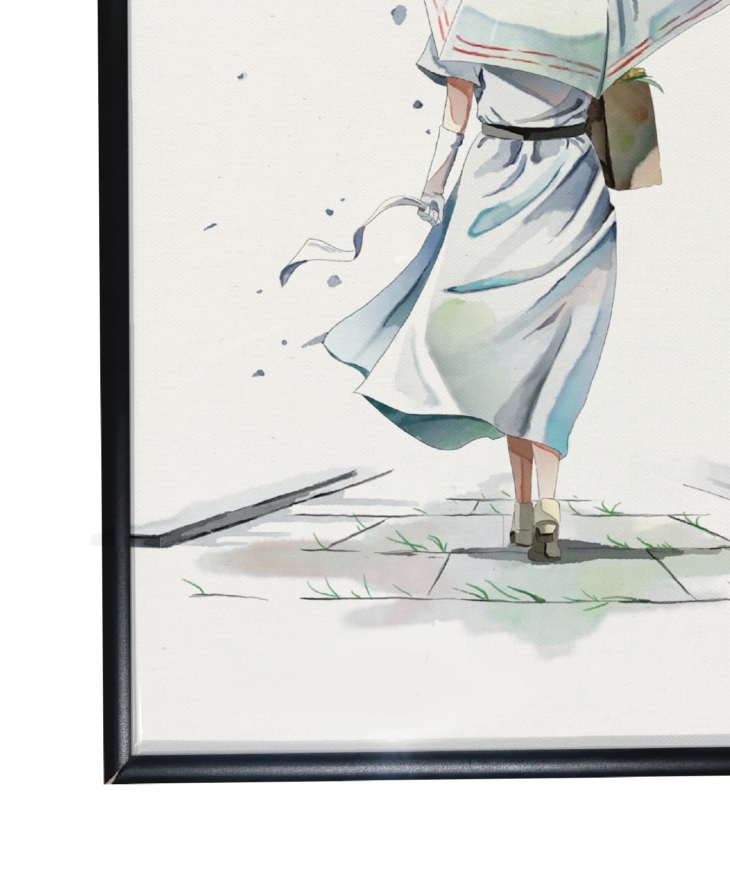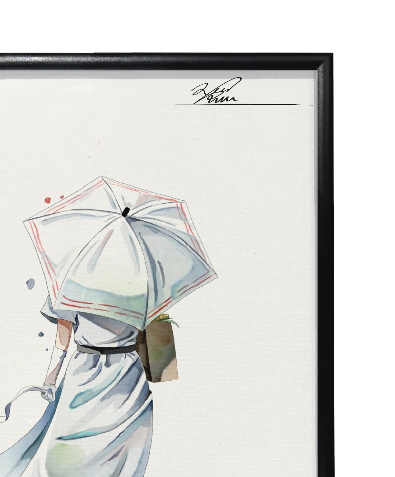 “White Summer” is an emotional art print capturing a woman in a white dress beneath her parasol — a moment where sunlight, silence, and beauty intertwine.